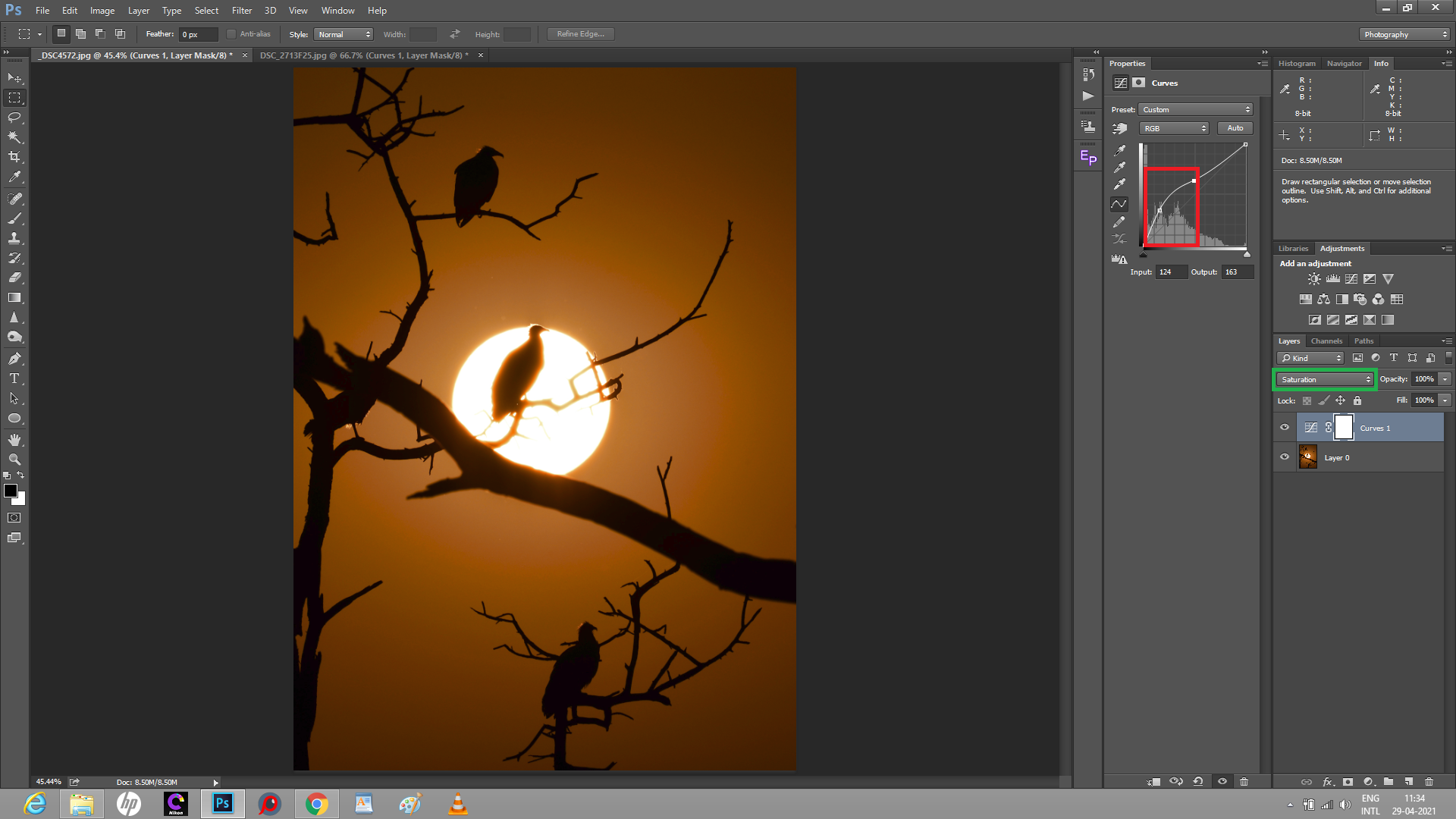 In the same way as Luminosity applied the curve only to the brightness of the pixels, Saturation blend mode affects only the saturation. It will not add contrast, nor will it change the color. That’s the power of these “property” blend modes.