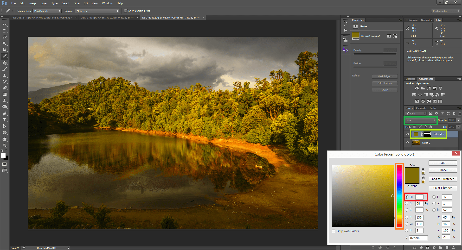 The golden hour has flushed some of the green hues in the trees. Let us say that I want the trees to be greener rather than orange. The Hue blend mode becomes useful in such scenarios.