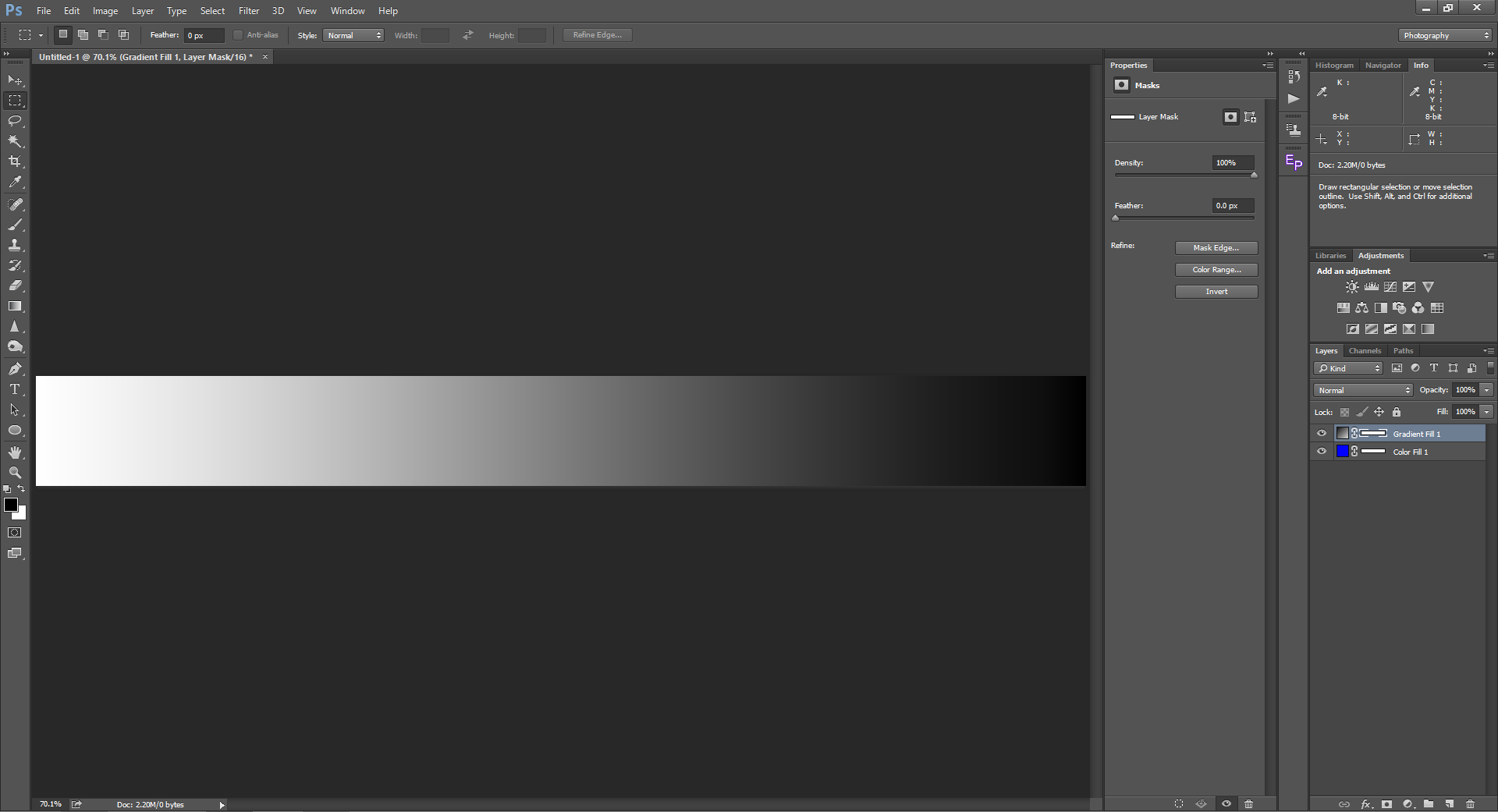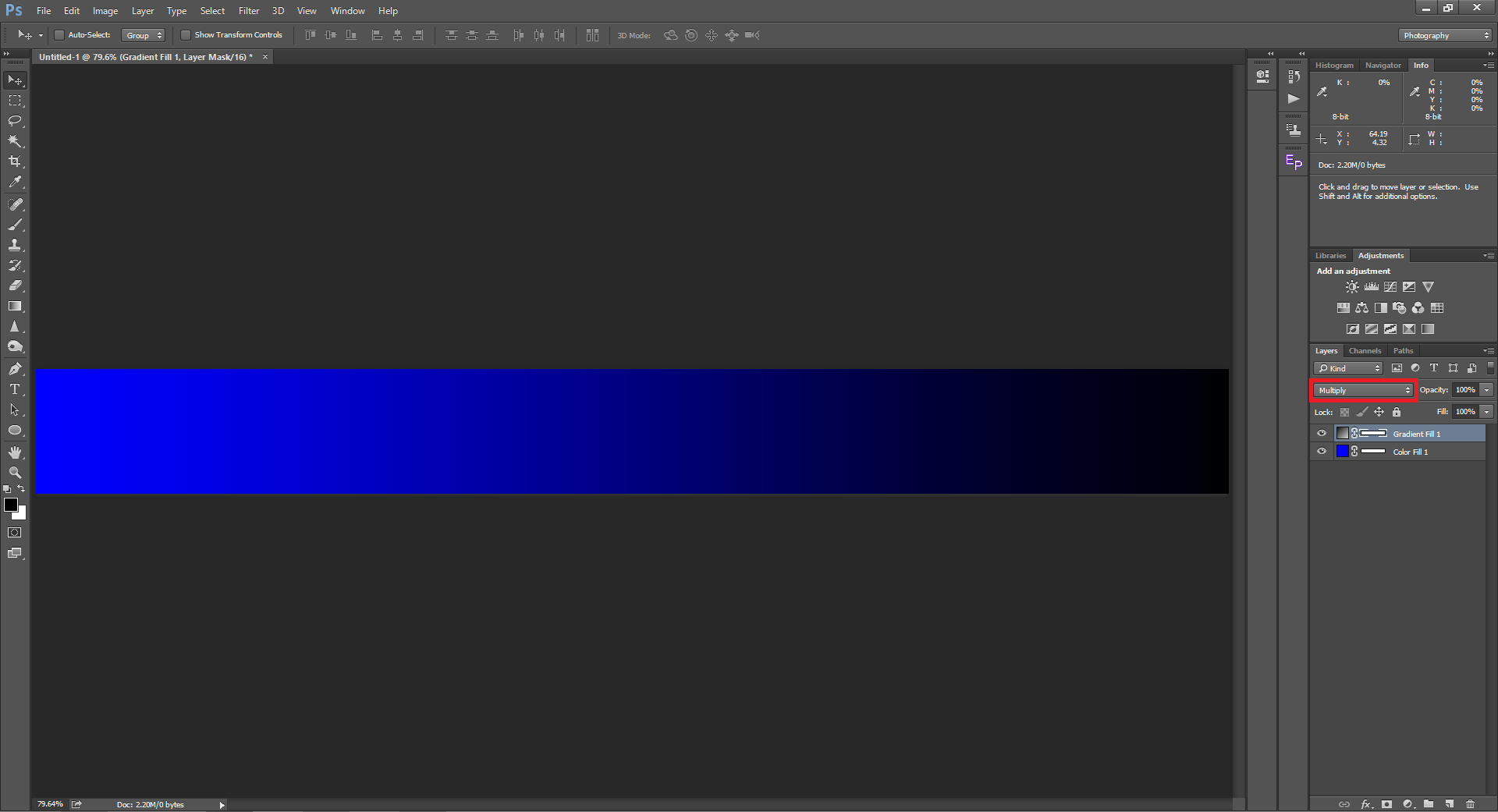 Let me explain how it works. Whatever photography means to you – art, science, even camera gear – to Photoshop, digital imaging is nothing more than mathematics. In the selected top layer, the brightest pixel in the gradient (pure white) can be represented as the number “1,” and the darkest pixel (pure black) as 0. When we multiply any number with 1, the answer is the number itself. When we multiply any number with 0, the answer is 0. The result is that our gradient is solid blue at the very left (since it’s “blue × 1 = blue”). On the very right, it’s solid black (since “blue × 0 = 0”).