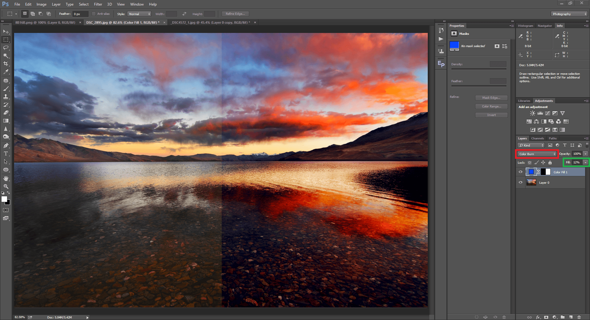Color Burn is one of the eight special blend modes. So, as mentioned earlier in this article, Opacity and Fill will give different results. Opacity will merely lower or increase the strength of the selected layer. On the other hand, Fill affects different parts of the image differently, keeping the darkening and color shift effects more strongly in the shadow areas.