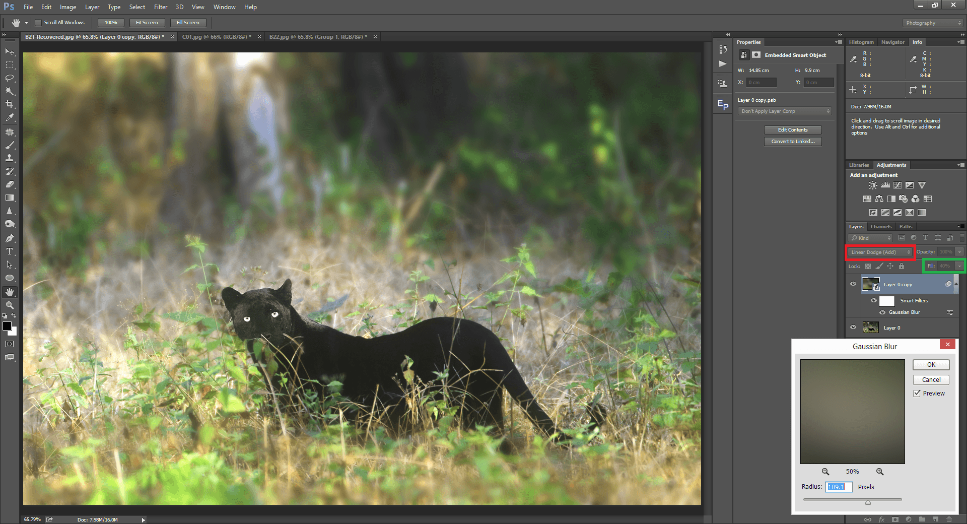 With Linear Dodge, creating Orton effect is a simple process. First, duplicate the layer with Control / Command + J. Second, convert the new top layer into a smart object. Then, select it and create a Gaussian Blur filter (Filter > Blur > Gaussian Blur). I used a radius of 109 pixels in this case, but if you think the blur or the brightness is too strong, you can always double click on the words “Gaussian Blur” below the layer to go back and lower it. (This is only possible if the layer is a smart object.)