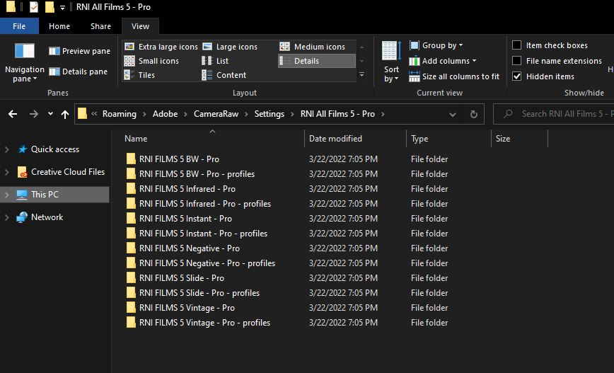 Some presets that apply via profiles, like the ReallyNiceImages (RNI) All Films pack, are installed differently. For these, you’ll need to consult the instructions that come with your presets. Some include an executable or other automatic installer, while some install differently on one OS compared to another. For example, RNI’s can install via a .pkg on MacOS, but have to be manually placed in an AppData folder on Windows. As a reference, I’ll walk you through the install process for RNI’s profiles on Windows: