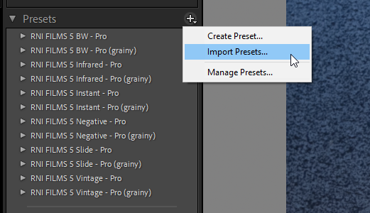 From here, you’ll see a plus sign. Click on that, then select Import Preset. Next, navigate to where on your hard drive you stored or unzipped the preset files. Click to select individual presets, or drag to select multiple, then hit import. After a few seconds, they should appear in your presets panel.