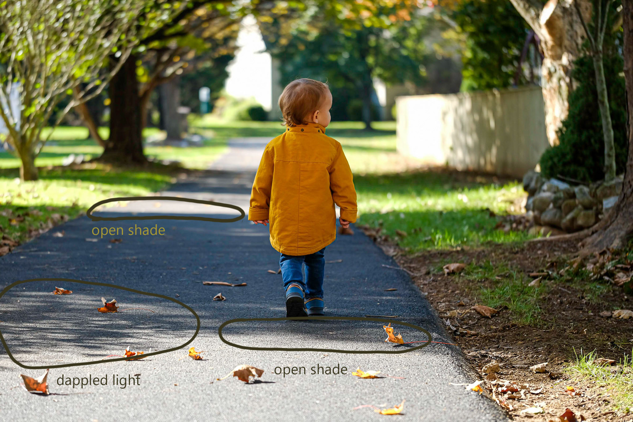 In the image below, by looking at the shadow patterns, it is easy to tell the difference between dappled light and the more optimal area of open shade. In this image, the subject is at an ideal spot along the edge of the open shade. The resulting light is both soft and bright. (If you wanted to photograph the subject’s face, don’t change your camera position; just get them to turn around and face toward the light.)