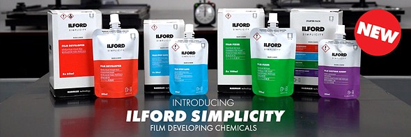 An image of Ilford’s line of ‘Simplicity’ chemicals, which come pre-mixed in easy-to-use packets. |