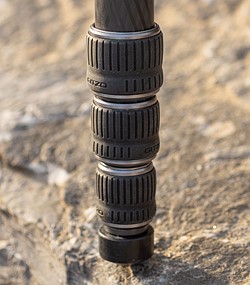 The leg angle locks are easy to pull out from the front, but hard to push from behind due to their slim internals. The ratcheting action is positive when pulling the leg down, and it is easy to set the angles of each leg. Unfortunately, the legs can be pushed under the apex and just keep going since there is no center column to stop them, resulting in a strange angle that sometimes makes packing up all three legs of the tripod a bit harder than it needs to be. Many other columnless tripods in this class have a hard stop at the stowed position.