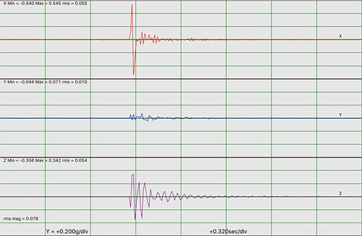 The tripod legs were fully extended, and our vibration analyzer for heavy-duty tripods (an iPad on a 3.2 kg (7 lb) cantilevered weight) was mounted directly to the flat platform’s 3/8″ threaded bolt with a long lens plate. An industrial solenoid valve with a plastic hammer was used as a source of vibration (a knock to the bottom of one leg). The resulting graph of all three accelerometers shows both the resistance of the tripod to the initial shock, as well as the rate of decay for residual vibration within the tripod.