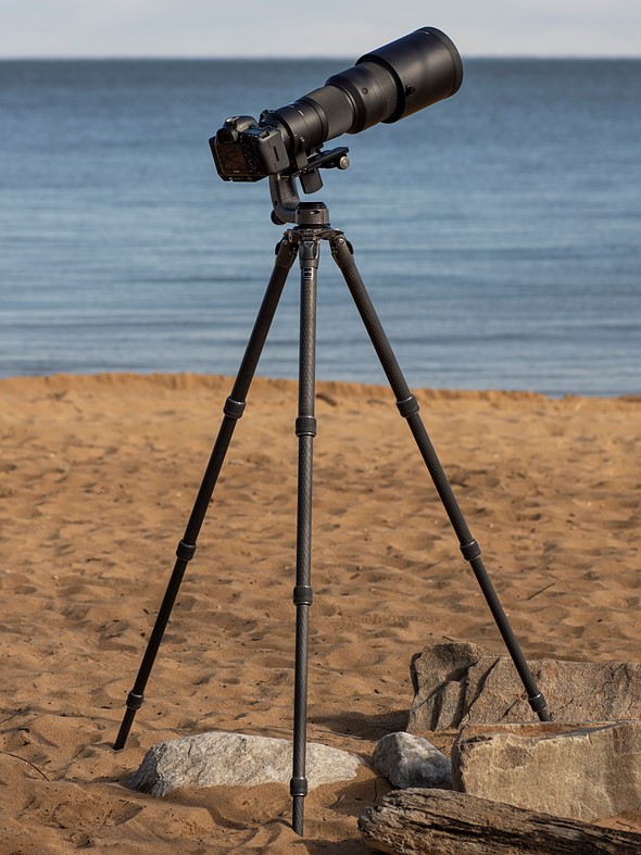 The Gitzo GT3543LS at the beach, with the Gitzo GFHG1 Fluid Gimbal Head on top, holding a 500mm lens and full-frame camera. |