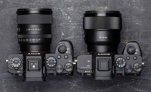 | The Sony Alpha 1 (left) shown next to an A7R IV, showing the slightly redesigned top-plate, which now includes a drive mode dial. |