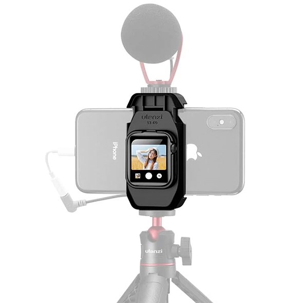 By using a paired Apple Watch and the ST-09, you can mount your smartwatch to the ST-09 and clamp it onto your iPhone. With the accompanying Apple Watch app, your Watch’s face becomes a live viewfinder mounted to the back of your iPhone.