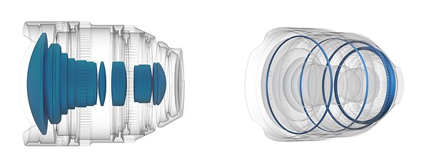 An illustration showing the optical construction (left) and weatherproofing seals (right) of the Irix 21mm T1.5 lens. |