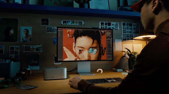 An artist working on editing an image on Apple’s new Mac Studio and Studio display. |