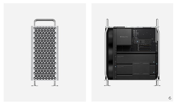 Left: The unique ‘cheese grater’ grille on the front of the Mac Pro. Left: The inside of a Mac Pro with a pair of Radeon Pro W6900X modules. |