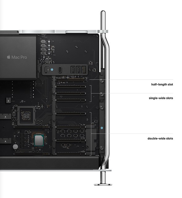 The Mac Pro offers one half-length PCI Express slot, three single-wide PCI Express slots and four double-wide PCI Express slots for nearly any combination of hardware imaginable. |