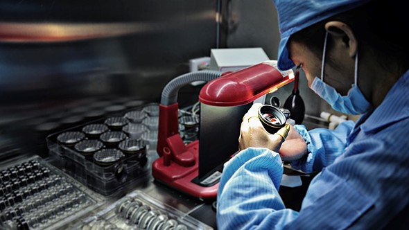 A KamLan production line worker poring over a 50mm F/1.1 MK2 lens. Image via KamLan. |