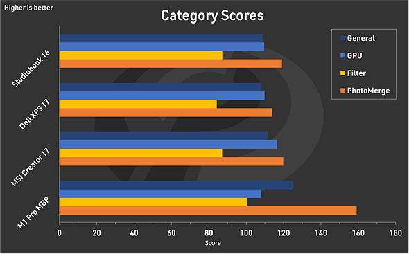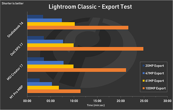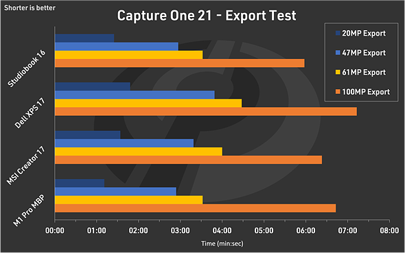 This is where having a discrete GPU begins to pay dividends, especially as file sizes get larger. Once you get to the 100MP Fujifilm GFX 100 raw files, the Studiobook 16 and MSI Creator 17 both outperform the Mac, with the Studiobook posting a significant win over every other computer we tested: