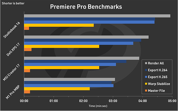 In these tests, the Studiobook 16 falls behind both the MSI Creator 17 and Apple MacBook Pro 14 by over a minute. That translates into a 21% to 30% decrease in performance compared to the Intel-based MSI, and a whopping 31% to 38% decrease in performance compared to the Apple Silicon-based Mac.