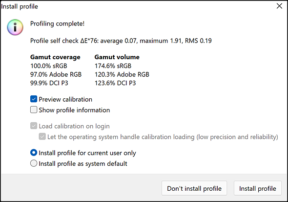 The good news: the built-in system appropriately calibrates your white point so that it’s spot on to D65, so all you have to do to take full advantage of this display is create a basic profile in an application like DisplayCAL. The bad news: if you don’t have any way to profile the display yourself, you’re stuck with a factory profile that clips your display primaries to DCI-P3 by default.