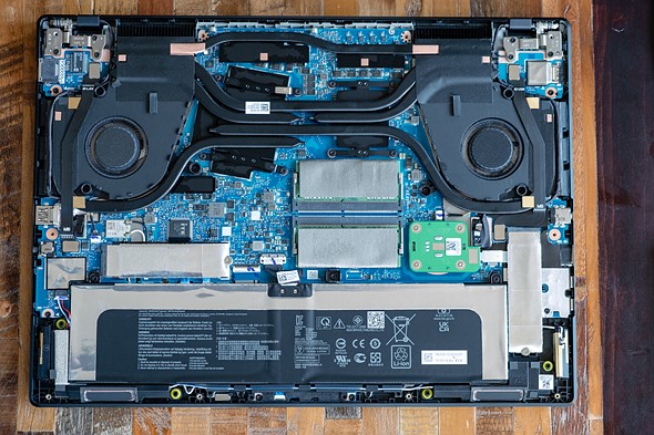 Finally, it’s worth mentioning the upgradability of the laptop. The underside is held on by 10 Phillips-head screws, with one screw sporting a discrete plastic add-on that notifies the factory if you’ve tinkered with your laptop (and voided your warranty). That’s a little annoying, but once the back panel has been removed, you have easy access to both RAM slots and both PCIe 3.0 M.2 slots, making this laptop extremely upgradable.
