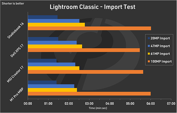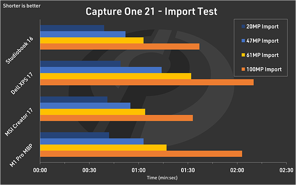 At import, we see the AMD-powered Studiobook 16 fall a little behind the competition, which are all using newer 11th-gen Intel or Apple Silicon processors with overall faster performance: