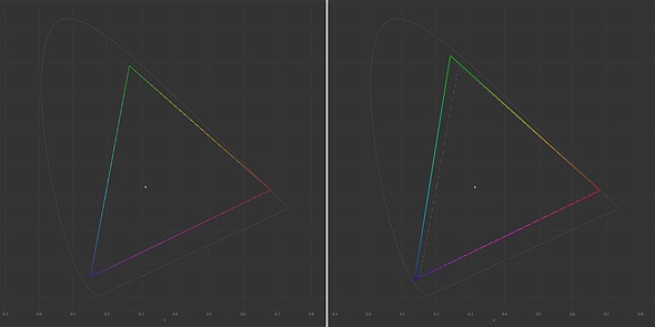 The factory calibration (left) is pegged to the DCI-P3 primaries (dotted line), but the native panel gamut (right) is actually quite a bit larger. |