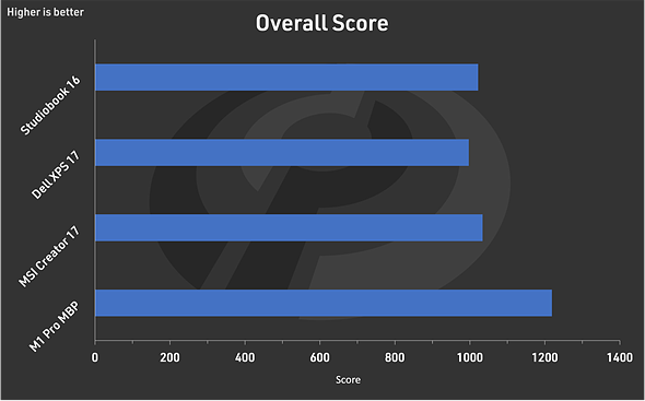 This puts all four of our computers on an equal footing, and the Studiobook 16 performs… well… as expected. It’s a bit faster than the Dell XPS 17 with its Core i7 CPU and NVIDIA RTX 3060 GPU, but a bit slower than the MSI Creator 17 with its Core i9 CPU and NVIDIA RTX 3080 GPU. However, as we’ve seen ever since the Apple Silicon M1 was released, the Mac is unbeatable in this benchmark. It’s ultra-fast CPU and RAM make up for any deficit in the GPU department, leaving the rest of the computers in the dust.