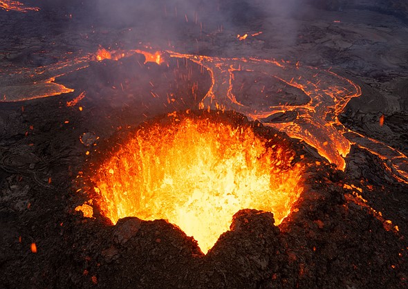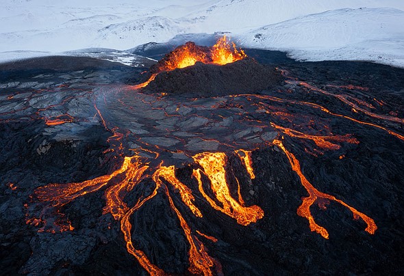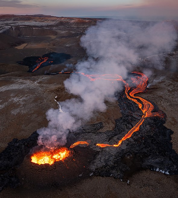 Fissure #2 created a lava pool, which at times spilled over, creating beautiful foregrounds, complementing a beautiful snowy background. DJI Mavic 2 Pro, f/8, 1/30 sec, ISO 100, vertical stitch |