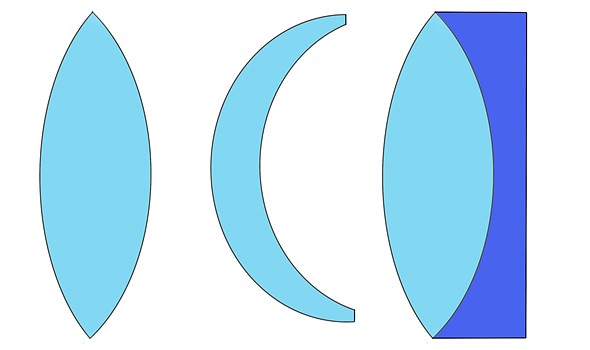 Left to right: a convex lens, a meniscus lens, and an achromatic doublet lens. Roger Cicala, 2021