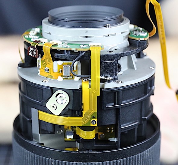 After removing more pieces, they got to the circuit board. The lens uses an array bent flex cables. Interestingly, it also includes two heavy-duty grounding wires. Lensrentals writes, with a trademark sense of humor, ‘I doubt it’s going to influence anyone’s purchasing decision, but rest assured, the circuit board is thoroughly grounded.’