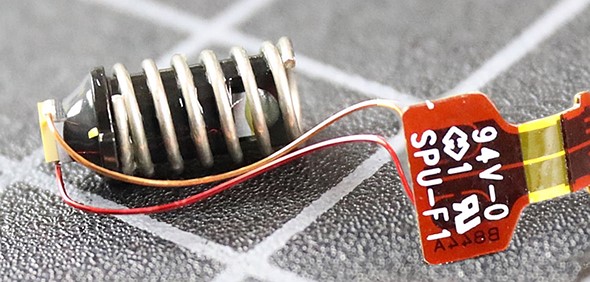 After removing as much as possible from the front of the lens, Cicala and Closz moved back to the lens’ rear and resumed taking it apart. Eventually, they got to an unusual spring. The spring has a small sensor or window or LED. Cicala and Closz aren’t sure precisely what it is, or if it’s responsible for the lens’ autofocus issues.