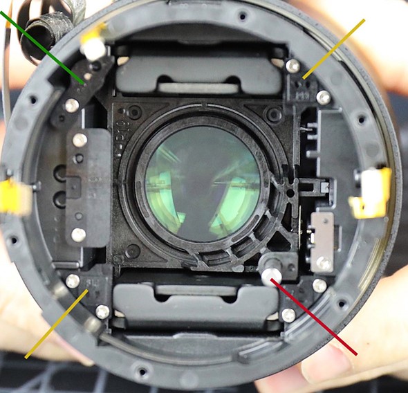 Moving on, the next element is the OIS unit. It’s held in place by thick nylon eccentric pegs and a metal bracket, which is a design the duo have never seen before – and they’ve seen a lot. The nylon pegs adjust tilt in the OIS unit. The OIS unit comes out of the lens as entire assembly. After removing it, you can see the focusing elements and the lens’ linear focusing motor. In the image below, ‘You can see the larger main sliding rod (red arrow) and the cover of the secondary sliding rod (green arrow). The other two corners of the focusing group fit into plastic corners (yellow arrows) to prevent any tilt with movement and both have soft rubber bumpers to minimize shock at the end of the focus group’s travel. You can see the tops of the two magnets at the top and bottom of the focusing group.’