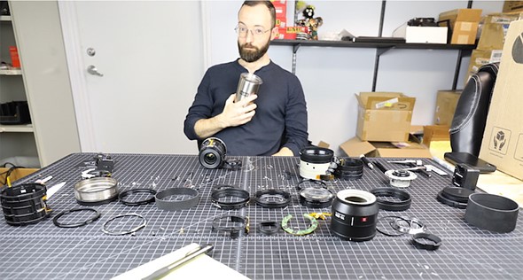 While you may be able to take apart your Panasonic S PRO 70-200mm F4 OIS lens, should its autofocus system stop working, good luck putting it back together. Aaron Closz is shown here with all the different parts of the lens that you need to disassemble to get to the root of the AF issue. Image credit: Lensrentals