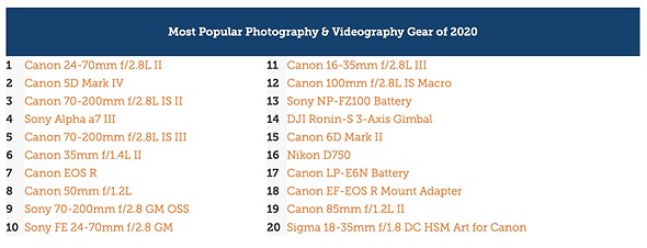 As has been the case for a number of years now, Canon absolutely dominates the list of most-rented gear. Canon holds 7 of the top 10 (70%) items and 13 of the top 20 (65%). Lensrentals also note Canon easily took the top spot for new releases in 2020, suggesting people seem more comfortable renting newer Canon gear compared to new offerings from other brands. To that end, Lensrentals’ data also shows that RF mount lenses rent at eight times the rate of Nikon Z mount lenses—a rather staggering statistic considering the new mirrorless mounts were released at the same time and have roughly the same number of lenses available for both mounts.