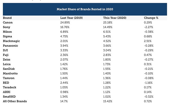All in all, across the board, the top five rental brands are Canon, Sony, Nikon, Sigma and Blackmagic, respectively. The only change in the top five compared to 2019 is Blackmagic, which overtook Panasonic for the final spot.