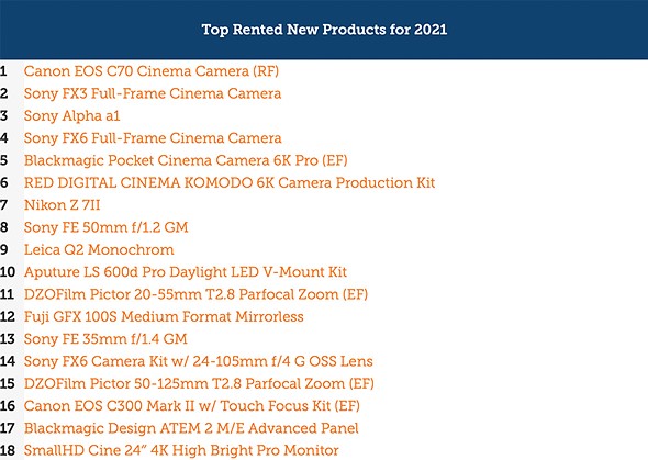 Looking first at the most rented new products of 2021, Canon took the top position with the EOS C70 Cinema Camera (RF mount). Cinema cameras occupy multiple spots on the list, including the Sony FX3 in second and the Sony FX6 in fourth. The Nikon Z7 II, although announced in 2020, is eligible for the list, landing in the seventh spot. The black-and-white specialty camera, the Leica Q2 Monochrom, is a fascinating inclusion at ninth. Likewise, the medium-format Fujifilm GFX 100S coming in at 12th is excellent news for the GFX system. The most popular new lens of 2021 is the Sony FE 50mm F1.2 GM.