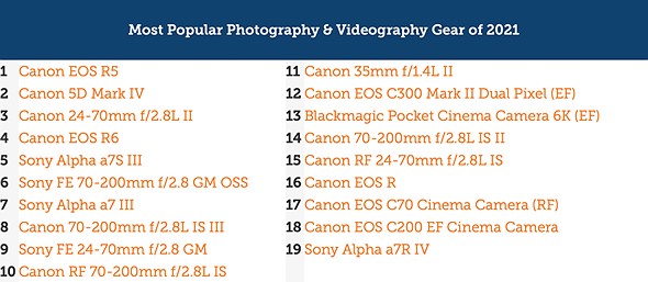 Lensrentals has published its roundup of the most popular rented gear for 2021, showcasing what camera equipment was the most rented throughout 2021. As we’ve seen over the past few years, both Canon and Sony top the charts across nearly every category.