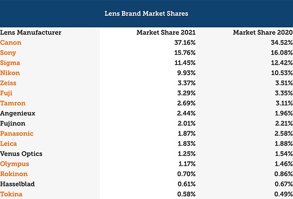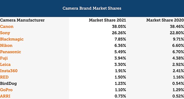 Looking at the camera brand market shares, Canon, unsurprisingly, takes the top spot with 38.05%, slightly down from 38.46% in 2020. Sony is second with 26.26%, which is up from 22.8% in 2020. Blackmagic comes in at a distant third with 7.85%, followed by Nikon, Panasonic, Fujifilm and Leica, respectively.