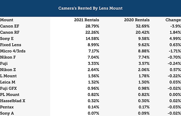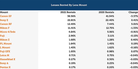 If we look at lenses rented by lens mount, Sony’s good year of new lenses helped buoy E-mount lenses to the second spot (22.81%) behind Canon EF (38.56%). Canon RF and Nikon F lenses proved popular, finishing third and fourth with 12.45% and 11.41%, respectively. Nikon Z lenses only gained 0.4%, whereas Canon RF gained an impressive 5.01%. It’ll be interesting to see how that trend fares in 2022.