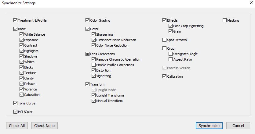 As I move through the files, I just sync the previous file’s settings over (via Sync Settings, Control+Shift+S), adjust for the higher ISO, and move on to the next file. With this, you can adjust all 4 files in a minute or two.