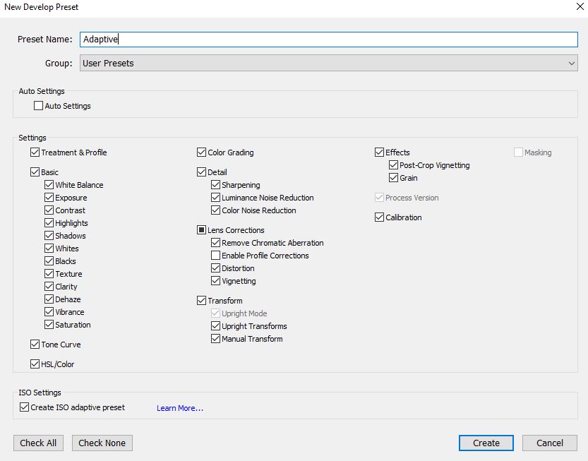 Make sure the NR and sharpening boxes are checked, and ensure the Adaptive ISO box at the bottom is checked. I recommend unchecking all the other boxes unless you want something like the camera profile or custom Basic Panel edits to be part of the preset as well. Then name and save your preset with a descriptive name (e.g. Z7 ISO Adaptive)