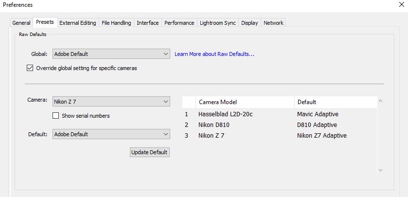 You can now go back and repeat the process for any other cameras you use. Lightroom even supports setting defaults on a per-serial number basis. This might be helpful if you’re shooting events with multiple camera bodies, or in some other special scenarios – let me know if you’ve made use of this feature, as it’s pretty unique.