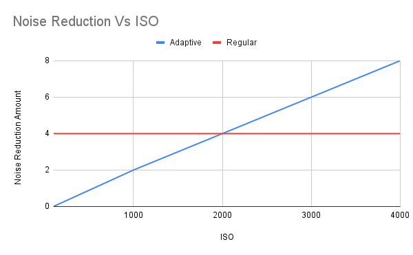 Our goal is for Lightroom to apply increasingly more noise reduction automatically at higher ISOs (the blue line below) rather than using the same noise reduction at every ISO (Lightroom’s usual default; the red line below).