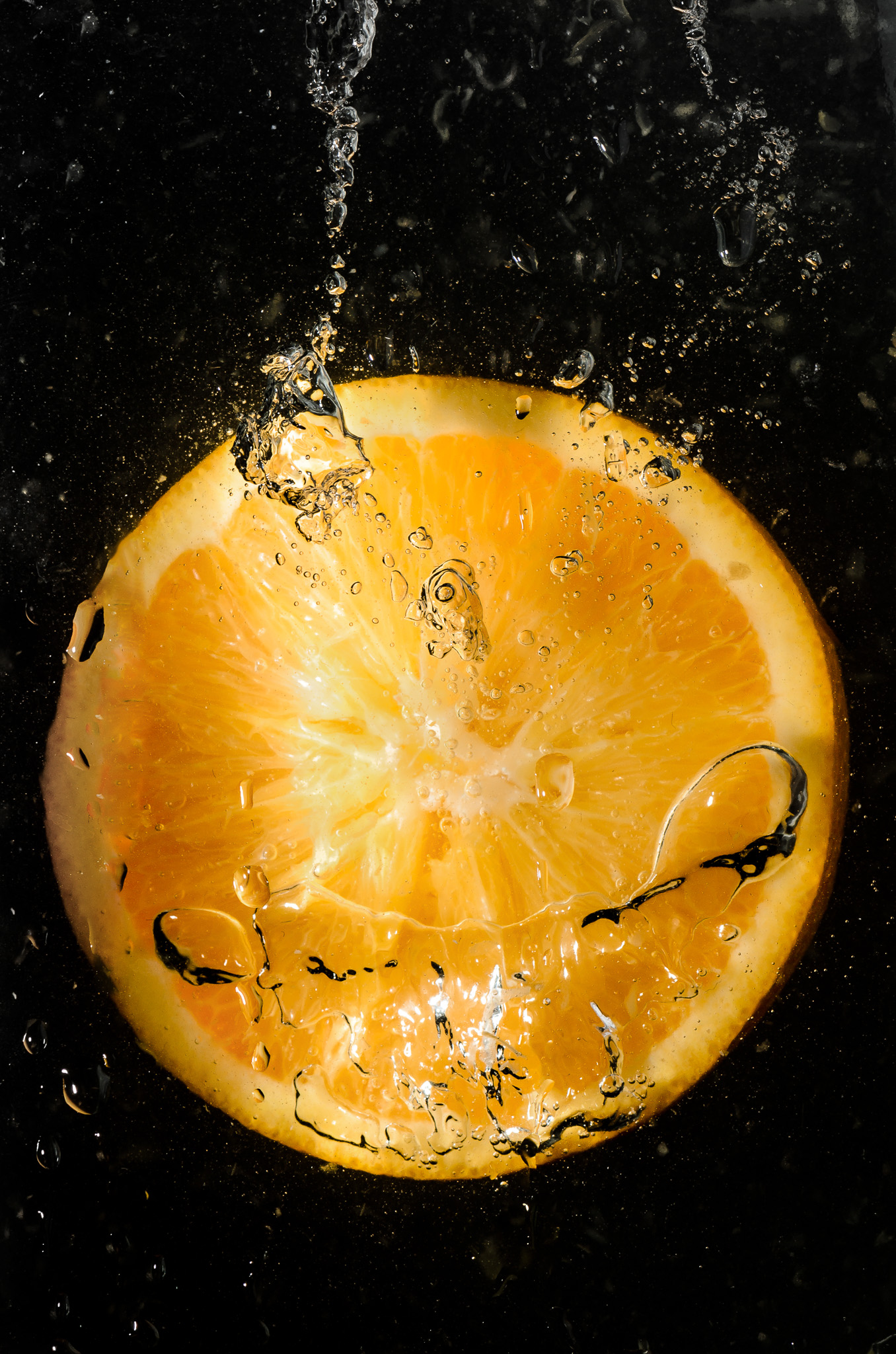 Experiment with different backgrounds, food coloring, and compositions in order to get some interesting results. For example, I took the following photo by placing an orange slice behind my subject, as you can see reflected in the water: