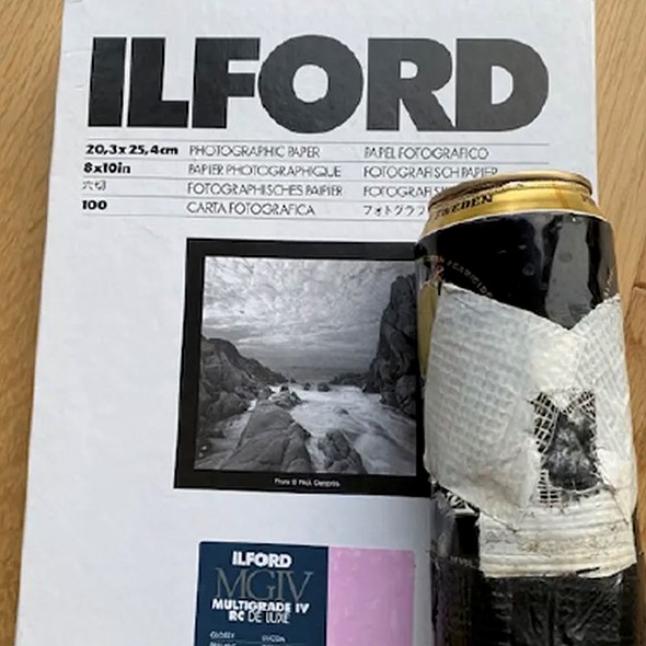 | The beer can pinhole camera and a package of similar Ilford paper as was originally used. Photo by Regina Valkenborgh. |