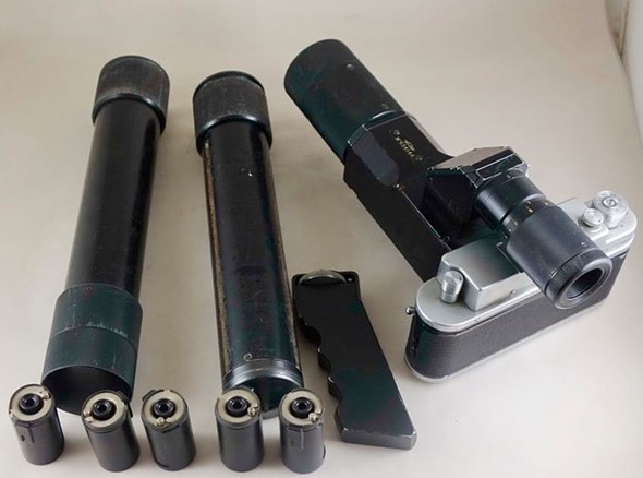 As spotted by Kosmo Foto, the modified 35mm rangefinder camera has a special lens assembly, decked out in stealthy black, that adds a reflex-style prism to the rangefinder camera. The kit for sale also includes various extension tubes to change the length of the lens. The spy camera is listed as being in ‘good’ condition.