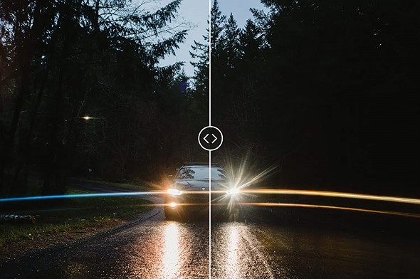 Moment CineFlare Streak filter – Blue Streak (left) versus Gold Streak (right) |