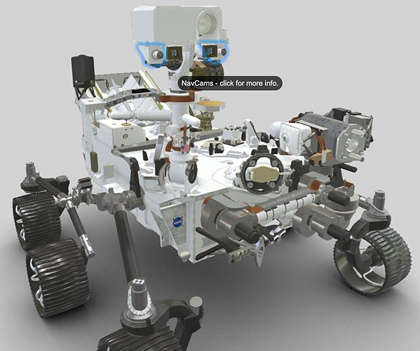 The images above were captured using Perseverance’s onboard color Navigation Cameras, or Navcams. The Navcams are on the remote sensing mast (or ‘head’) of Perseverance. The Navcams are part of a group of 19 total cameras on the rover itself. You can see the location of the Navcams on a 3D model of Perseverance below. If you’d like to explore the 3D model for yourself, you can do so here.
