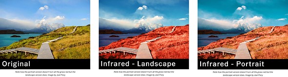 There are two color infrared filters, one for landscapes and the other for portraits. The strength of the effect can be adjusted, moving between turning green plants pink or making them appear redder. In the Infrared Portrait filter (IR2), skin tones are preserved for a more natural look to the skin.