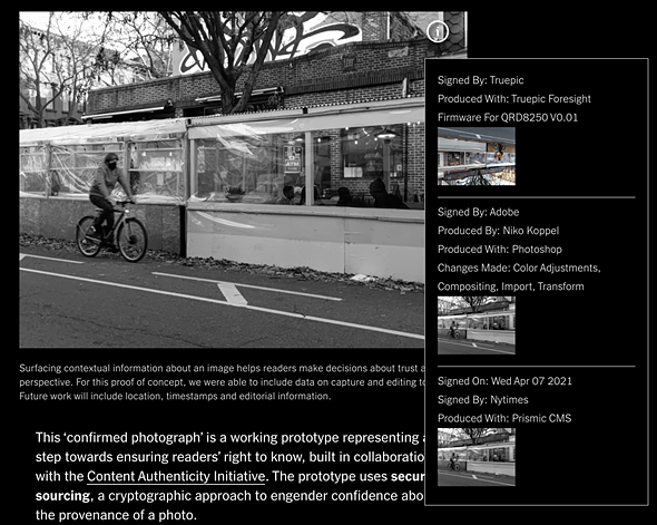 Misinformation is a big issue online, especially with how quickly false stories are shared. The New York Times R&D team has worked with the Content Authenticity Initiative (CAI) on a prototype system ‘exploring tools to give readers transparency into the source and veracity of news visuals.’ If a picture is worth a thousand words, the picture must be verifiably truthful to its viewers.
