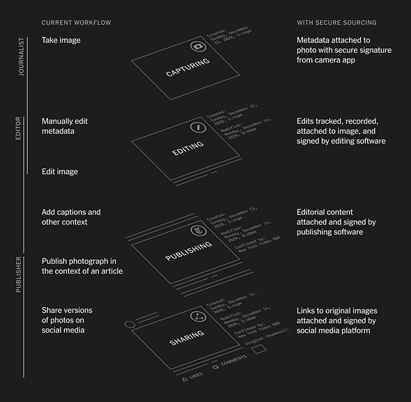 Along with Adobe and Twitter, The New York Times Co. is a founding member of the CAI. The CAI and its partners ‘are working to develop an open industry standard that will allow for more confidence in the authenticity of photographs (and then video and other file types). We are creating a community of trust, to help viewers know if they can believe what they see.’ To this end, the new prototype outlines a ‘secure sourcing’ workflow, which will preserve metadata with secure signatures at each step as an image is captured, edited in Adobe Photoshop, and published. As an image is published, links to an original image will be attached and signed by a social media platform.